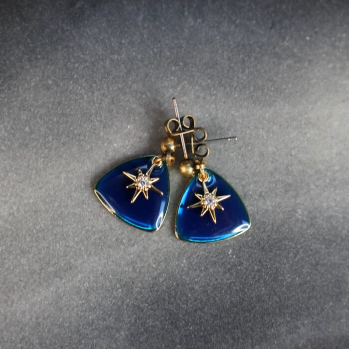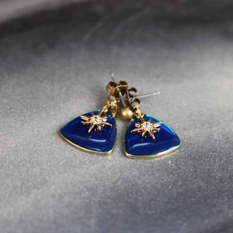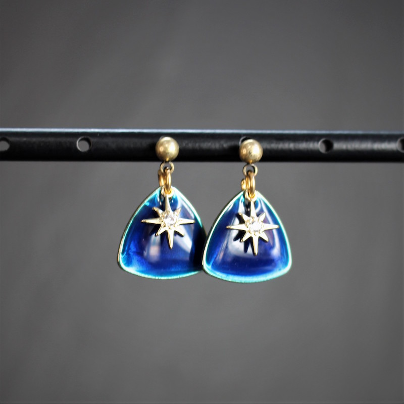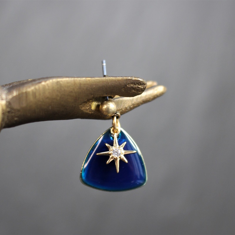 Laiton doré à l’or fin, acier inoxydable, émail et strass en cristal de verre.