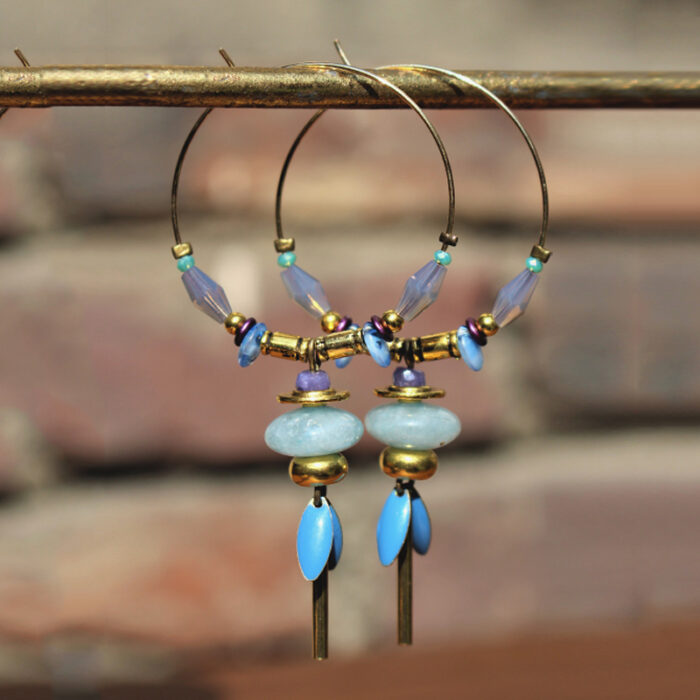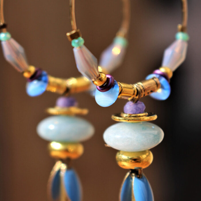 Laiton doré à l’or fin, amazonite, émail, cristal de Swarovski et pâte de verre.
