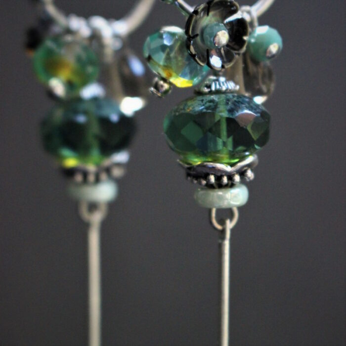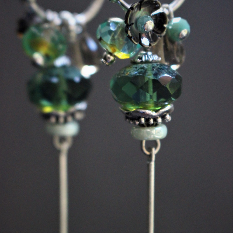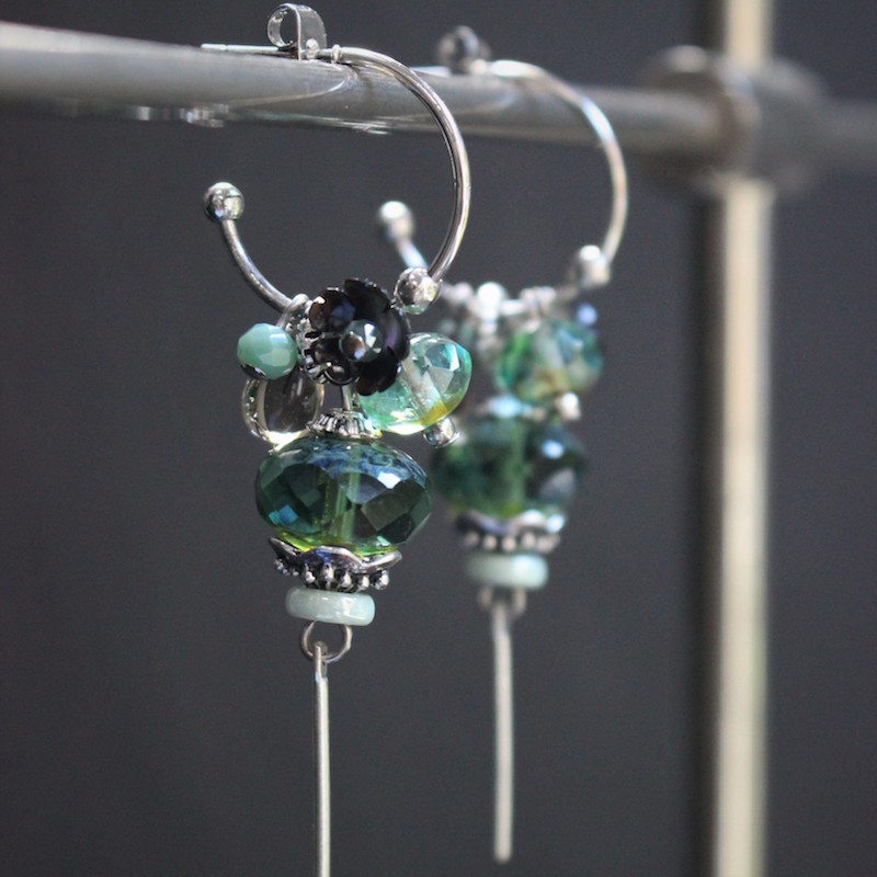 Laiton argenté sans nickel, nacre et pâte de verre.