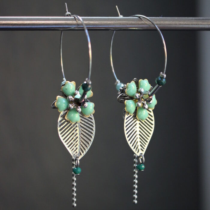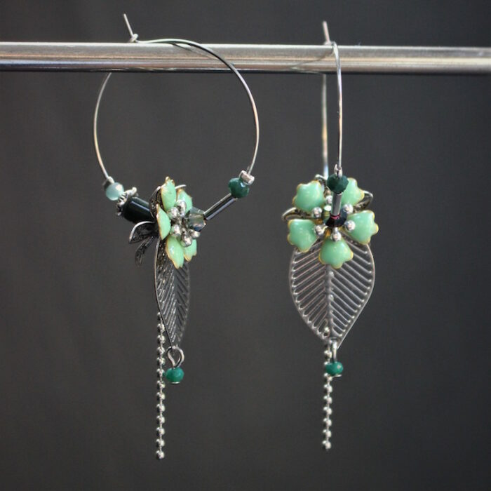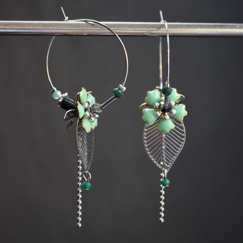 Laiton argenté sans nickel, cristal de Swarovski, pâte de verre et émail.