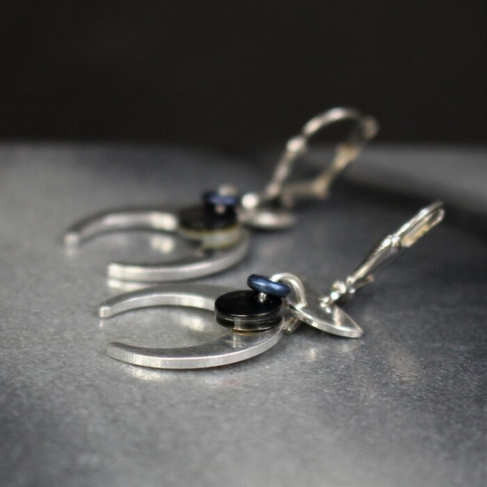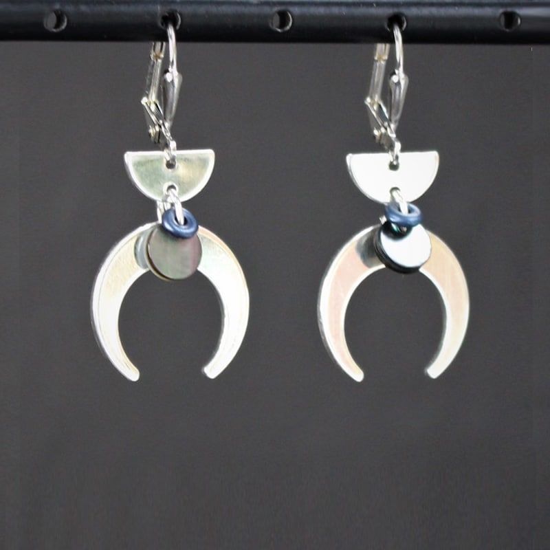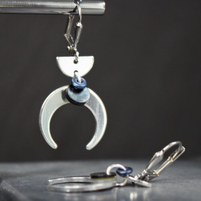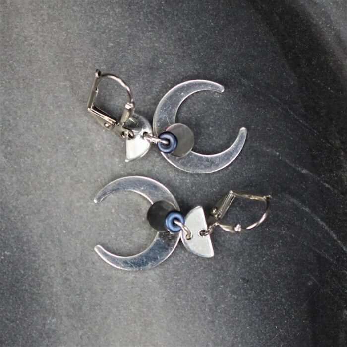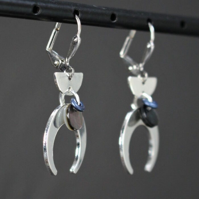 Laiton argenté sans nickel, nacre grise et pâte de verre.
