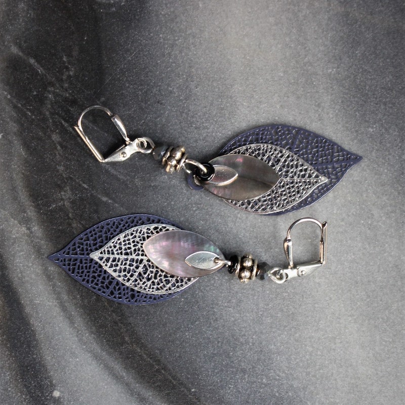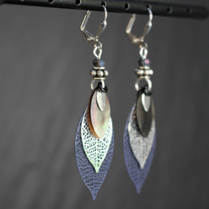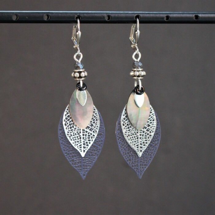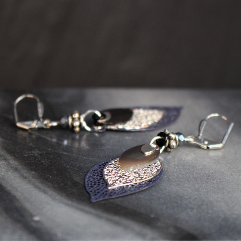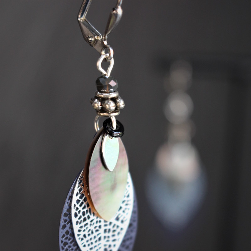 Laiton argenté sans nickel, nacre et pâte de verre.