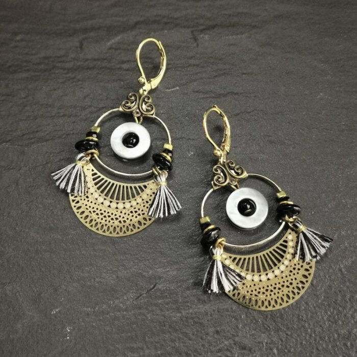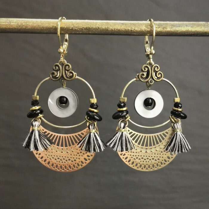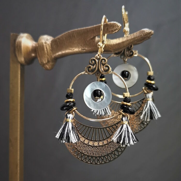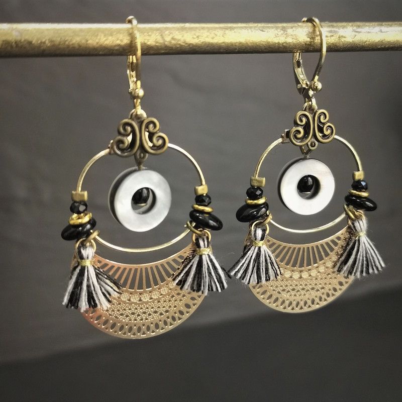 Acier inoxydable, laiton doré à l’or fin, nacre, pâte de verre et fils de coton.