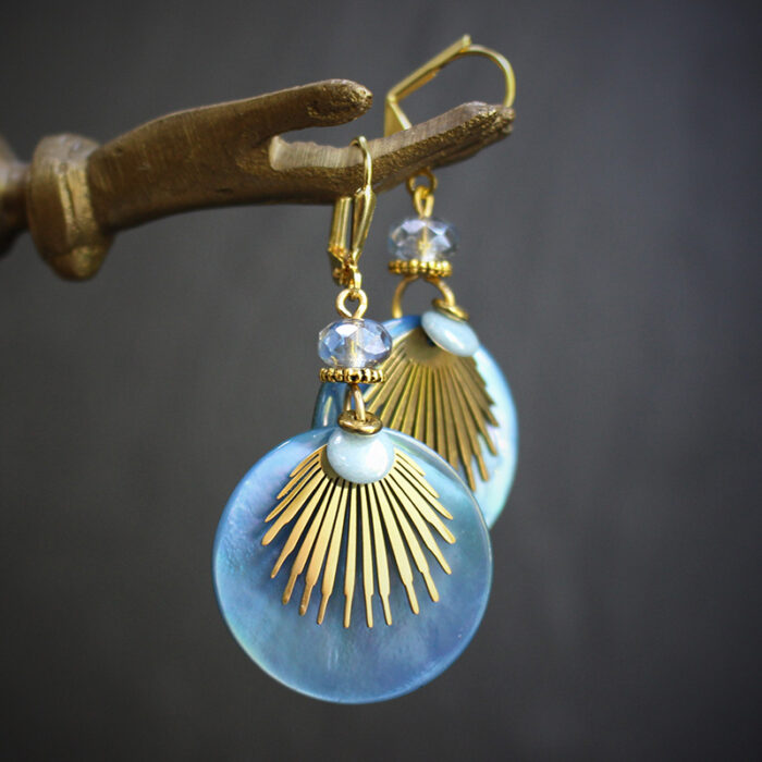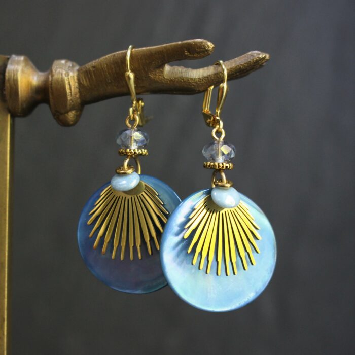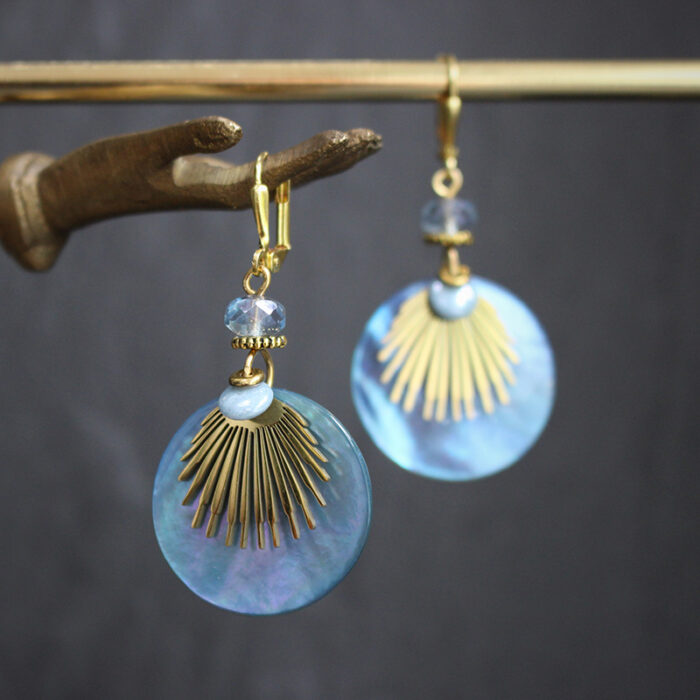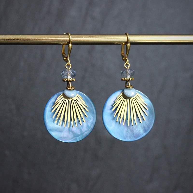 Acier inoxydable, laiton doré, pâte de verre et nacre.