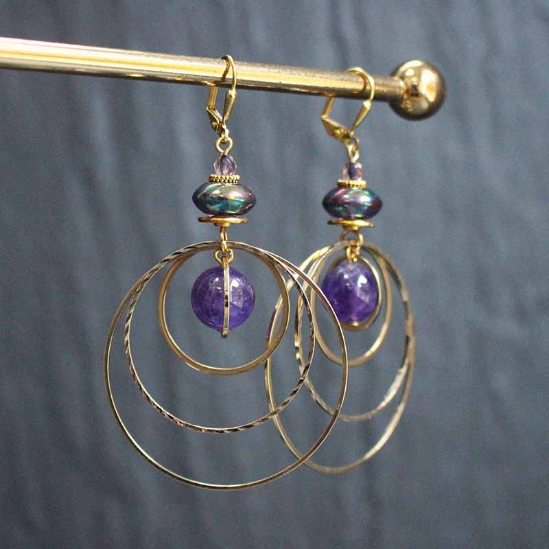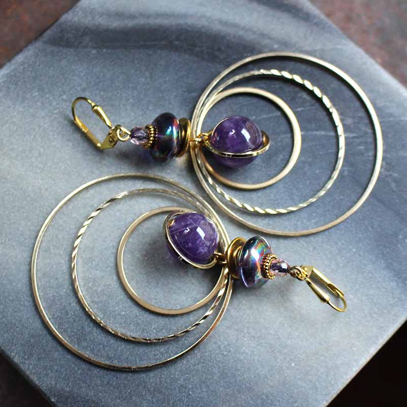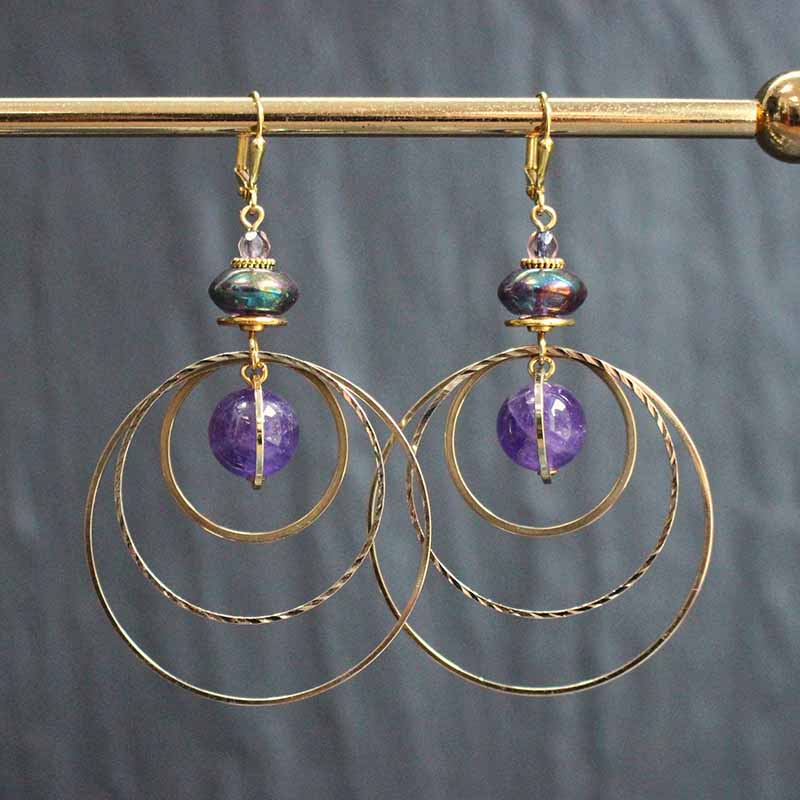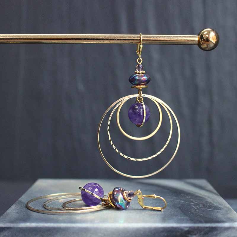 Laiton doré à l’or fin, acier inoxydable, améthyste et pâte de verre.