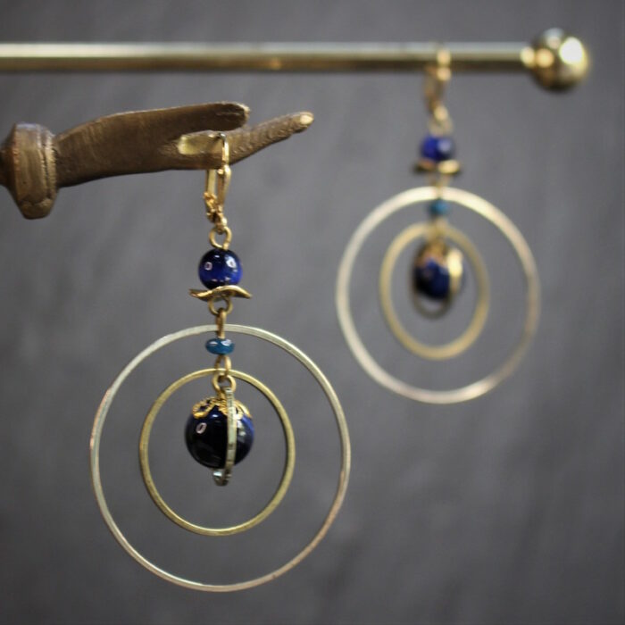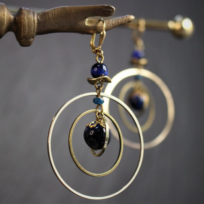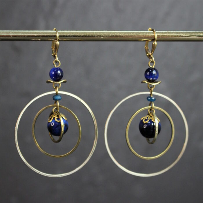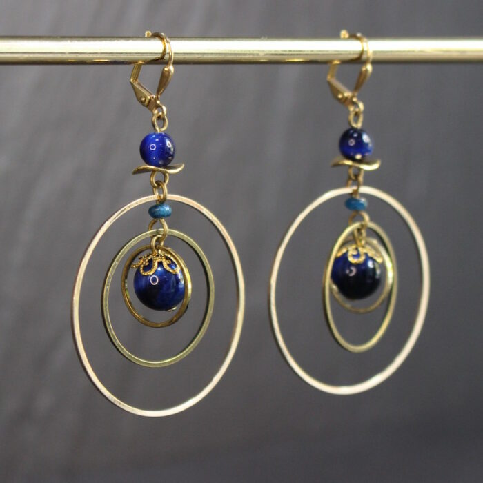 Laiton doré à l’or fin, œil de taureau bleu foncé et célestine.