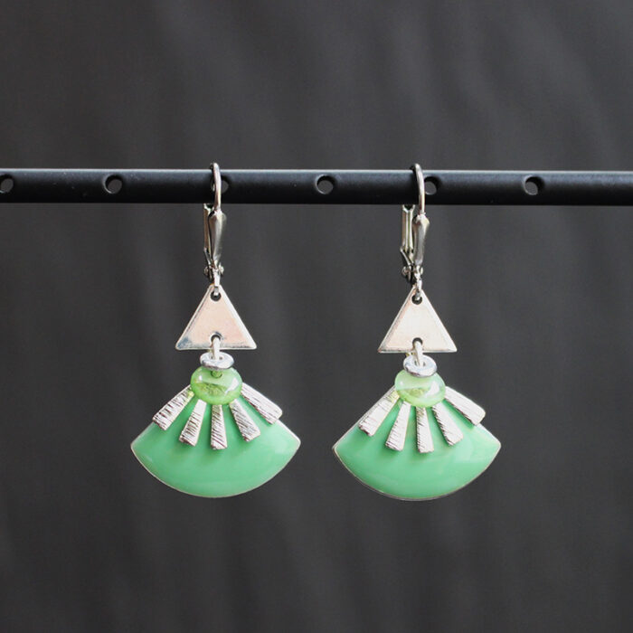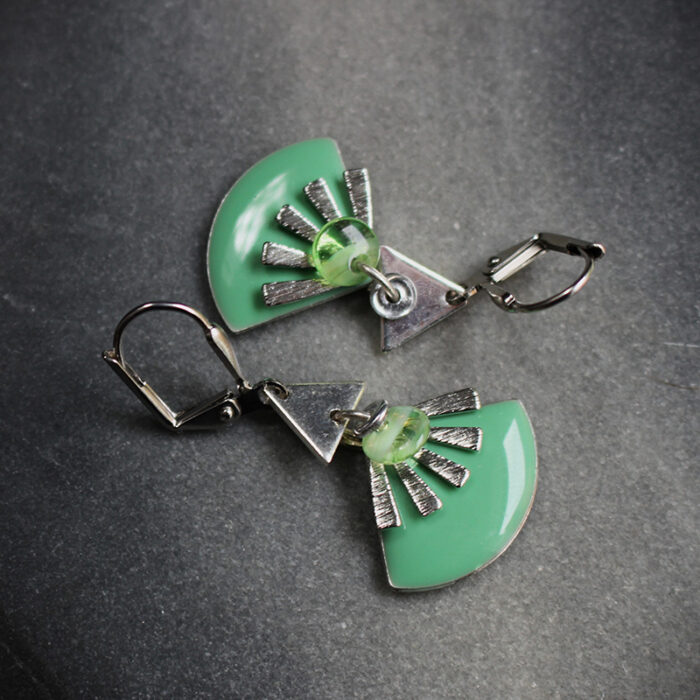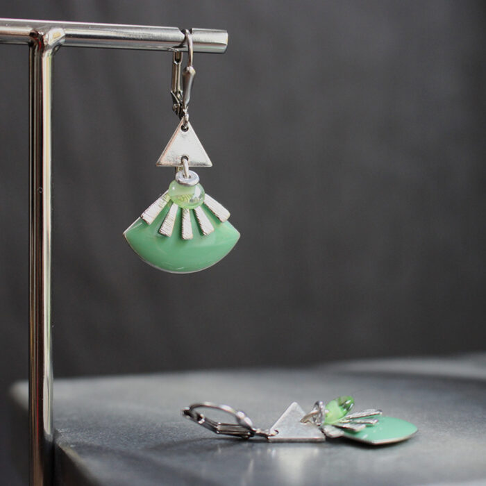 Laiton argenté sans nickel, émail, nacre et pâte de verre.
