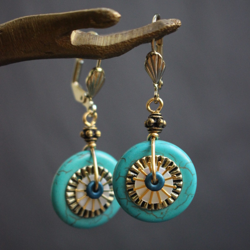 Laiton bronze doré à l’or fin, turquoise, nacre et pâte de verre.