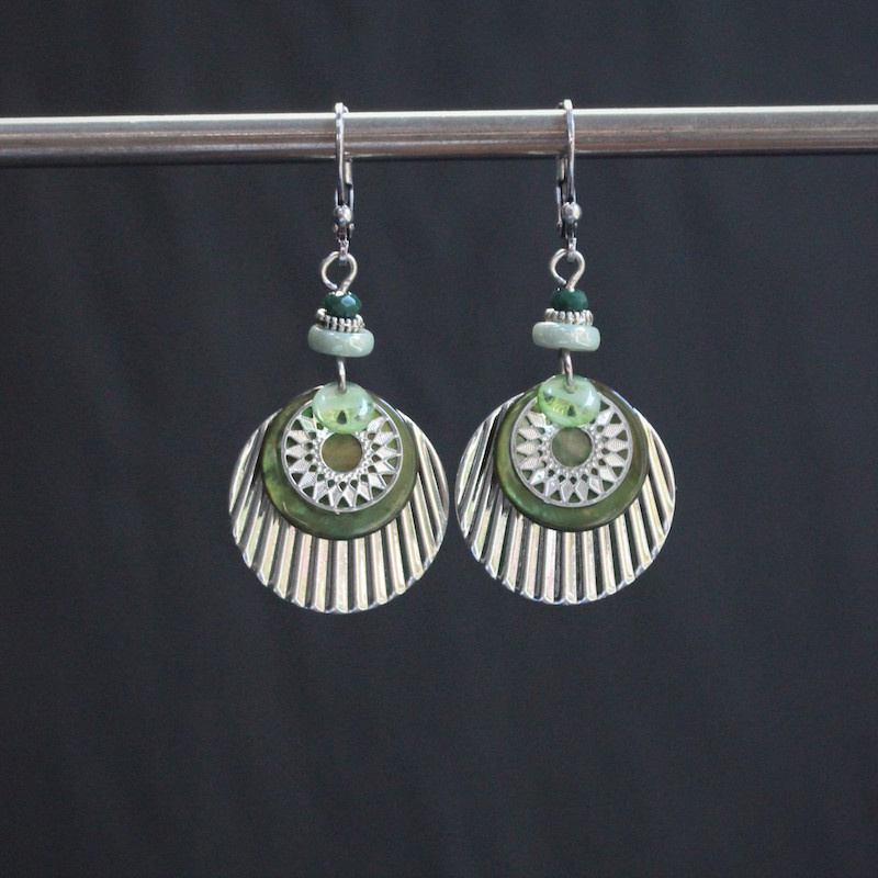 Laiton argenté sans nickel, nacre et pâte de verre.