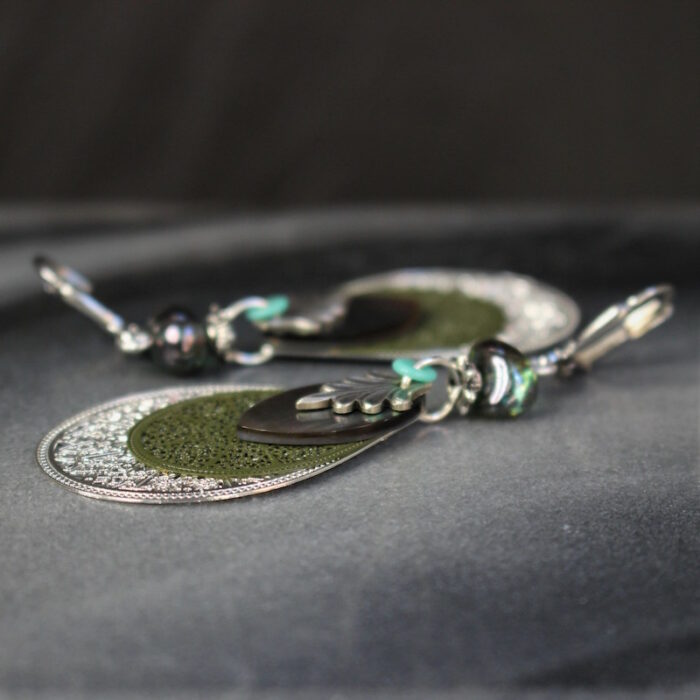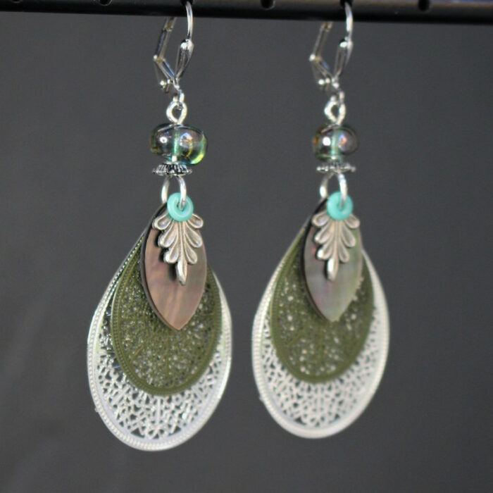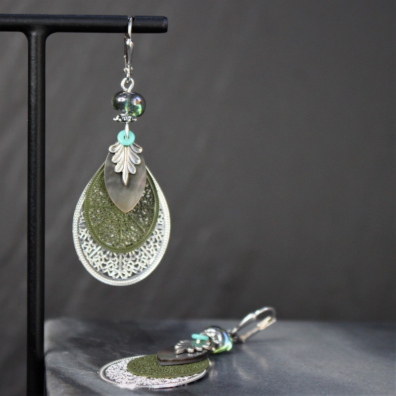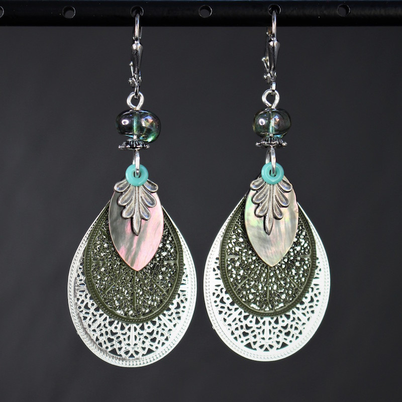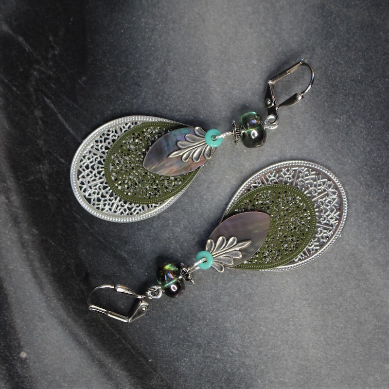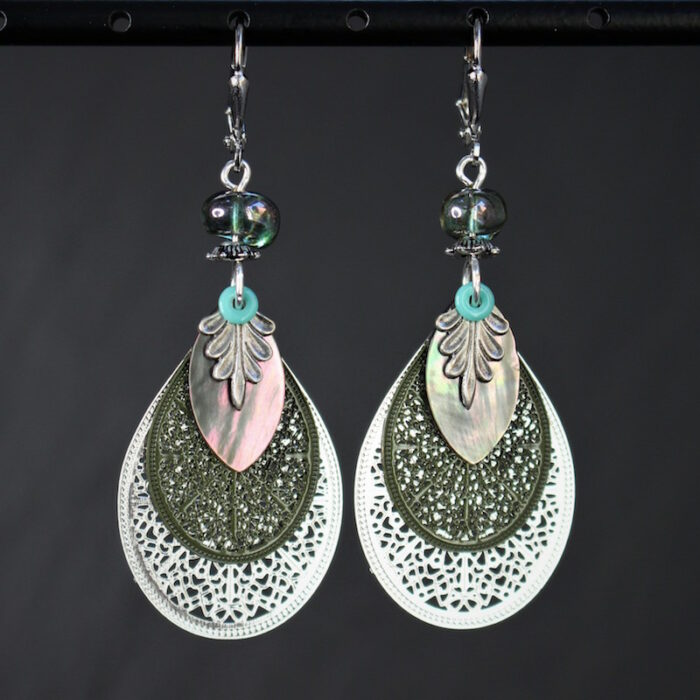 Laiton argenté sans nickel, nacre et pâte de verre.