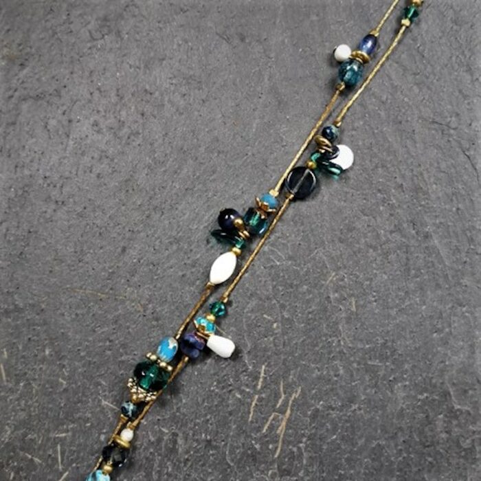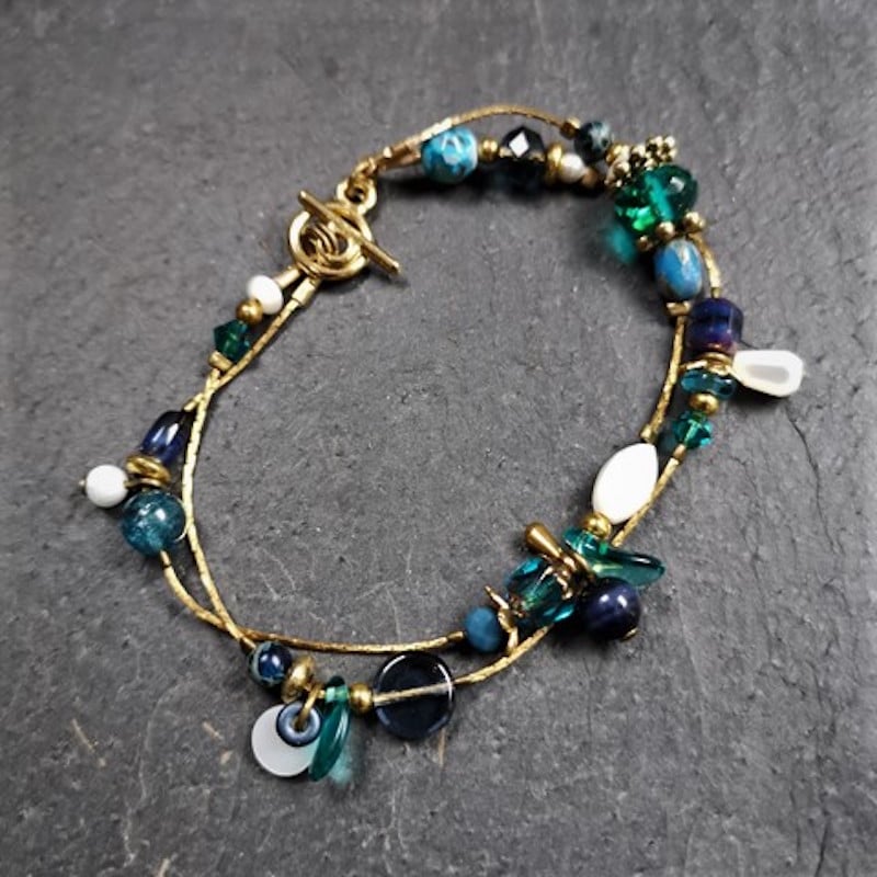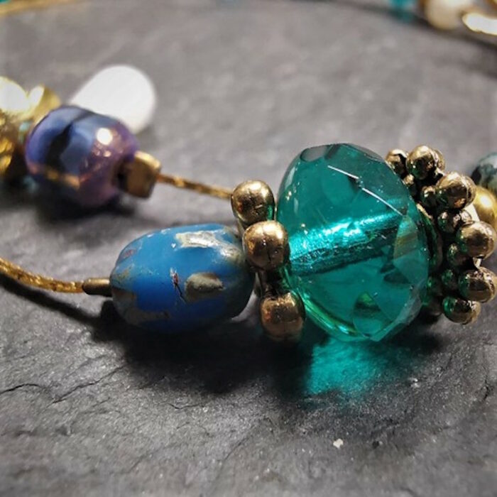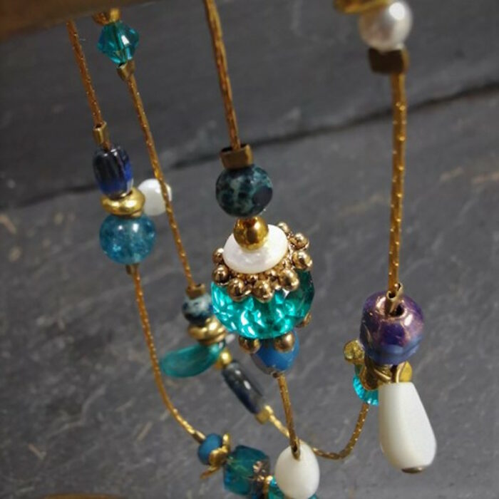 Laiton doré à l’or fin, nacre, jaspe, agate, cristal de Swarovski et pâte de verre.