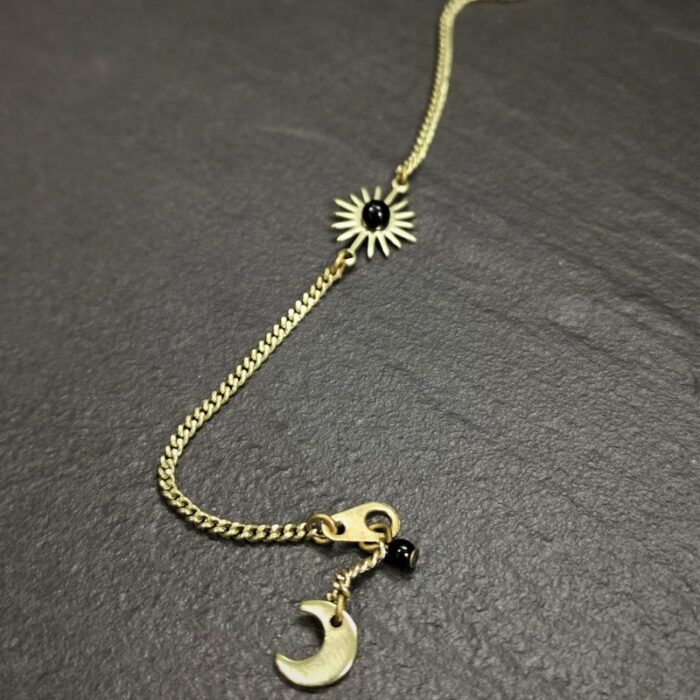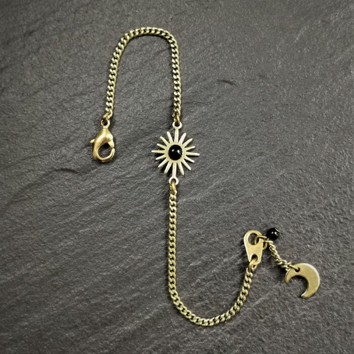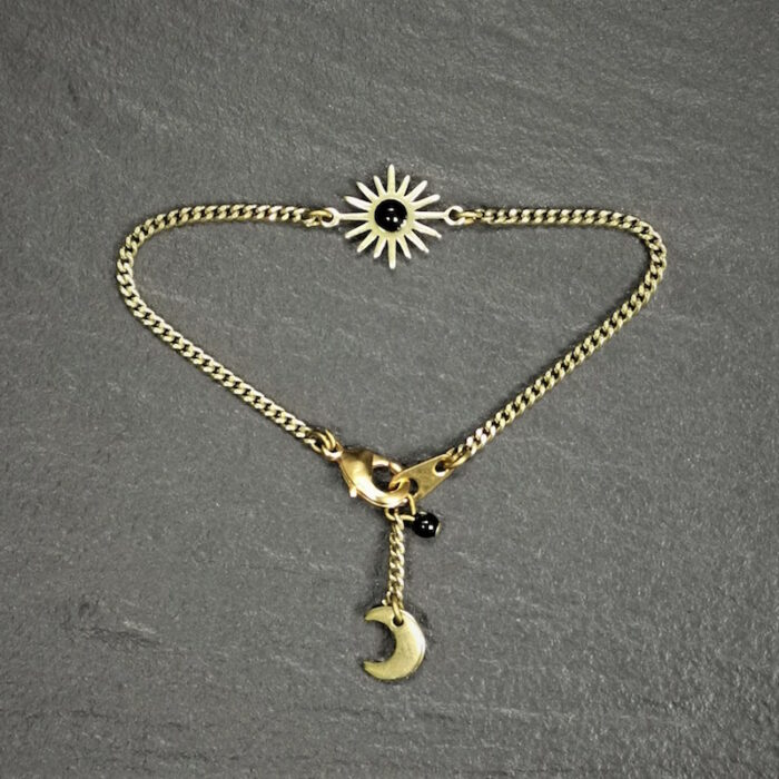 Laiton bronze et doré sans nickel, agate et pâte de verre.
