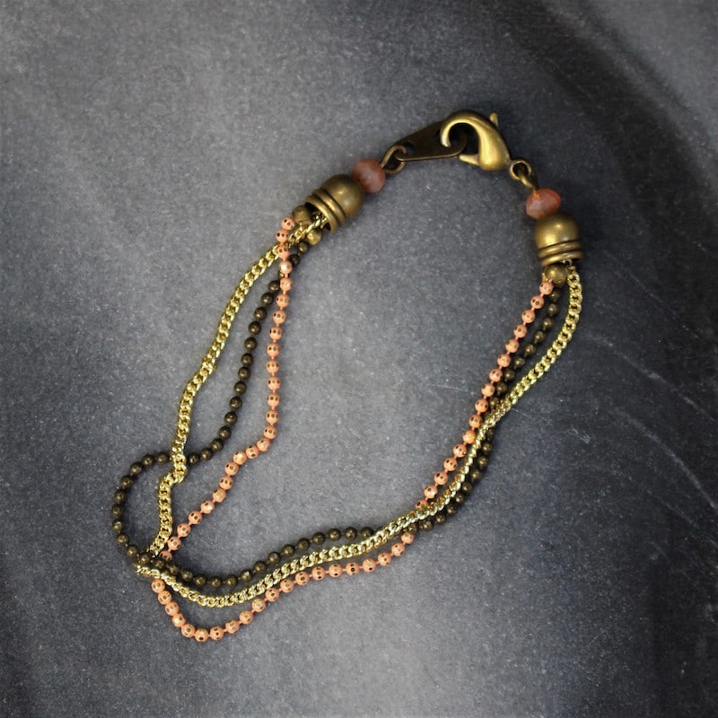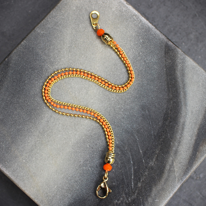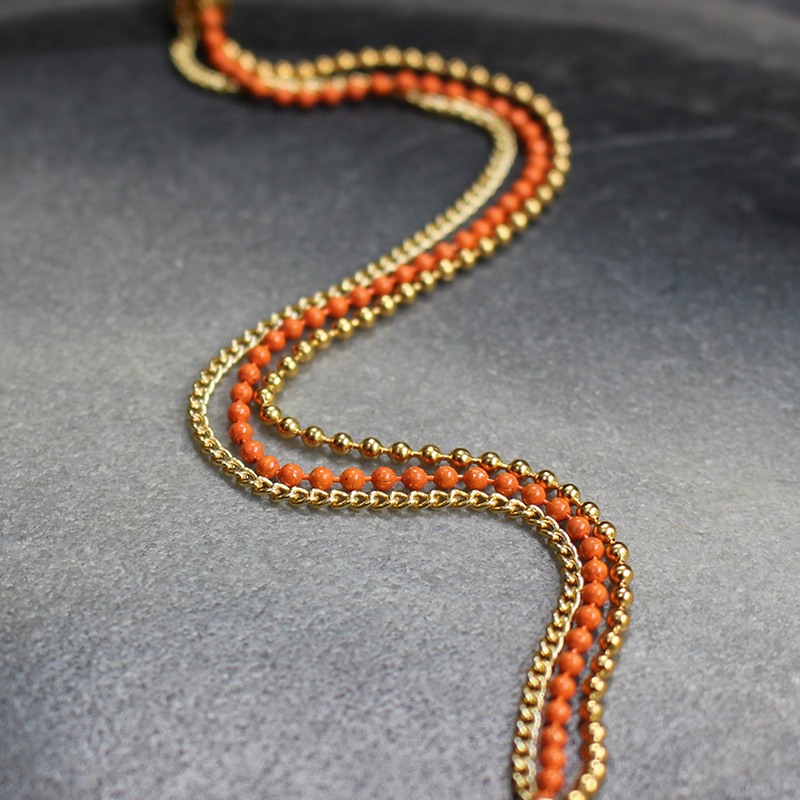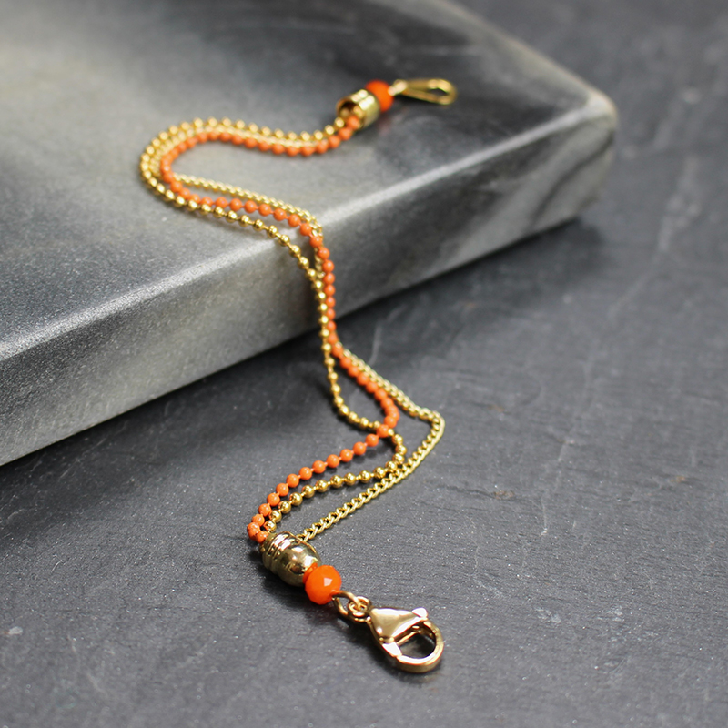 Acier inoxydable, laiton coloré et doré à l’or fin, pâte de verre.