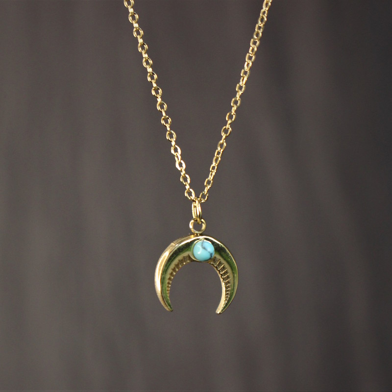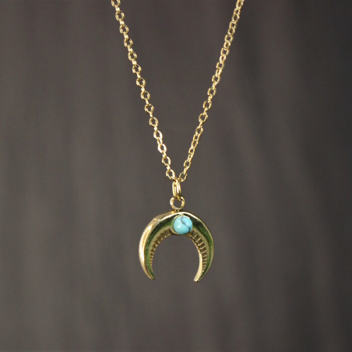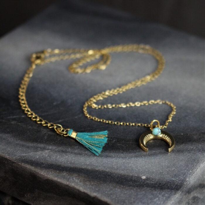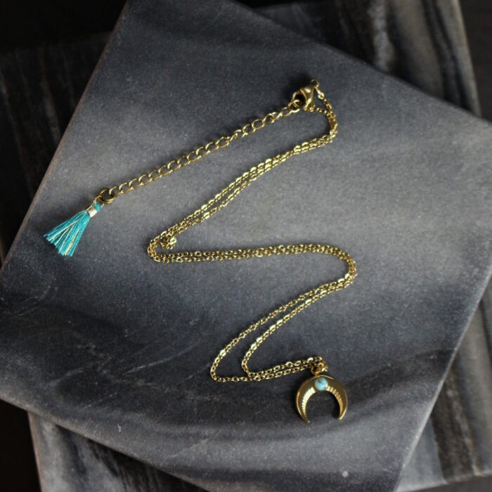 Acier inoxydable, laiton doré à l’or fin, émail et pâte de verre. Longueur de chaîne: 40 cm + 5 cm de chaîne de réglage. Hauteur du pendentif: 2 cm