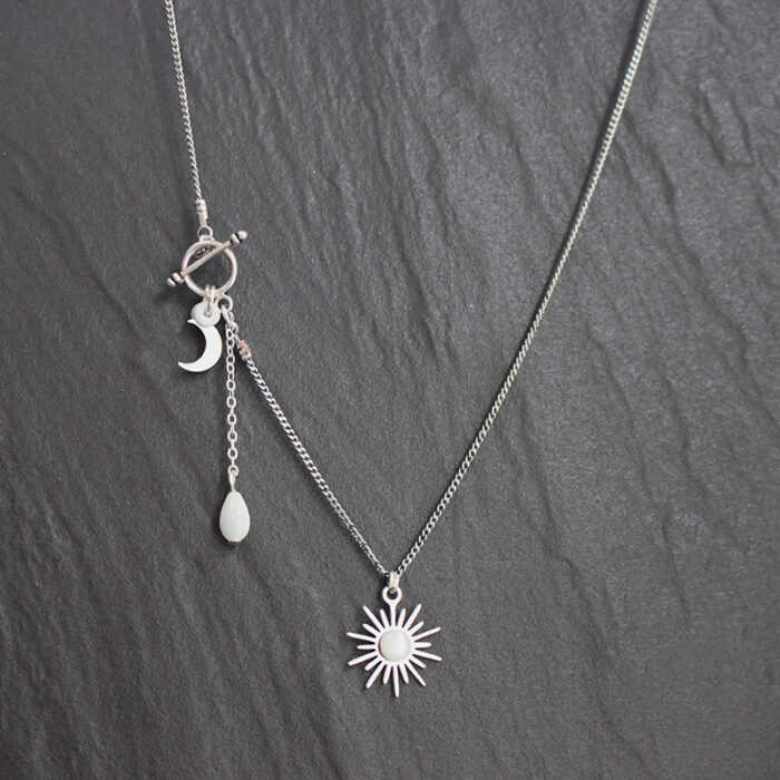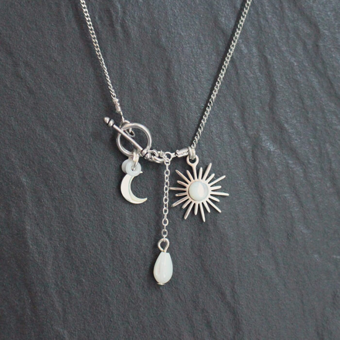Laiton argenté sans nickel, nacre et pâte de verre.