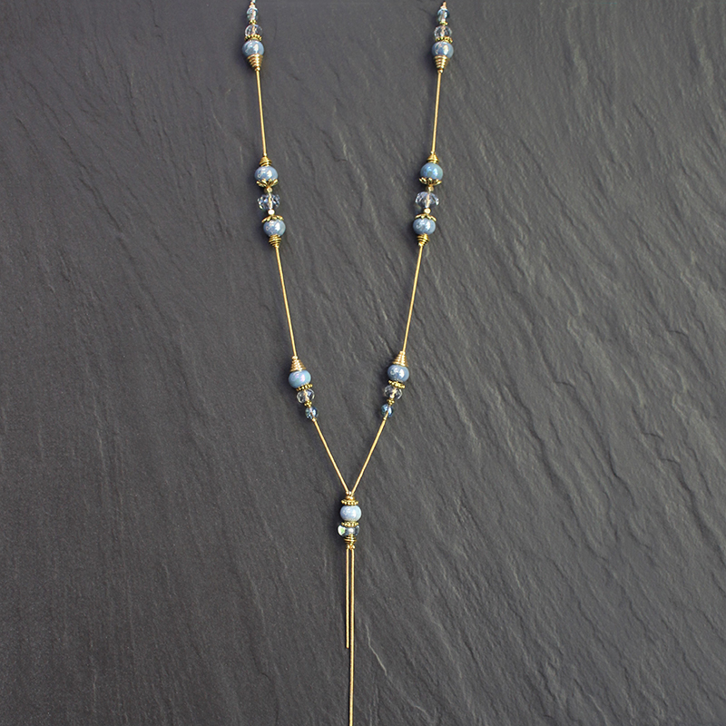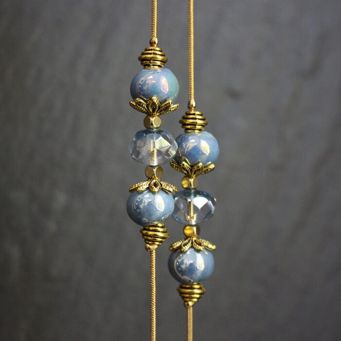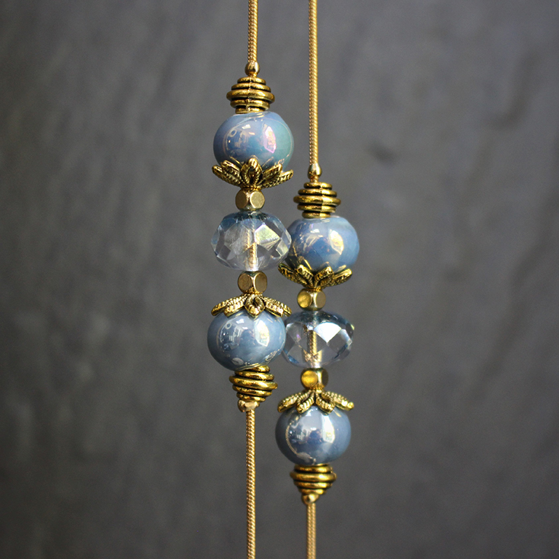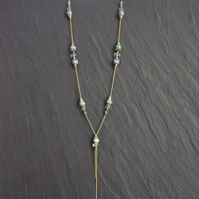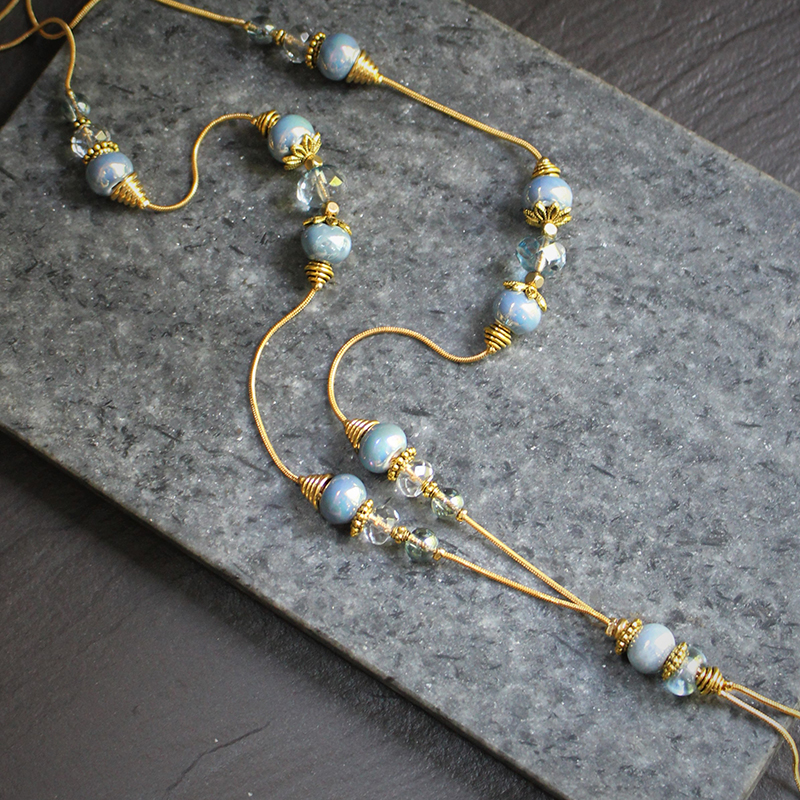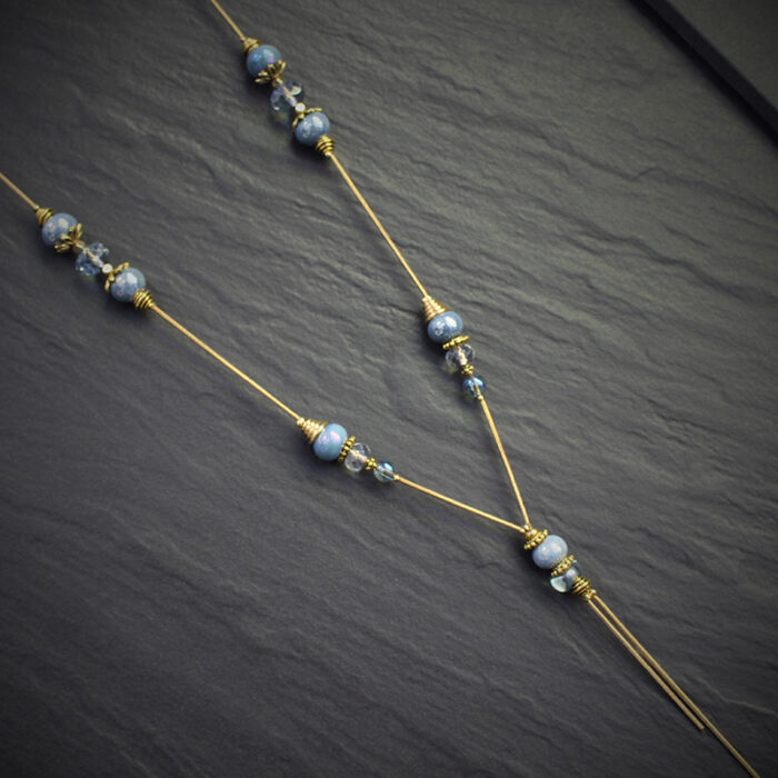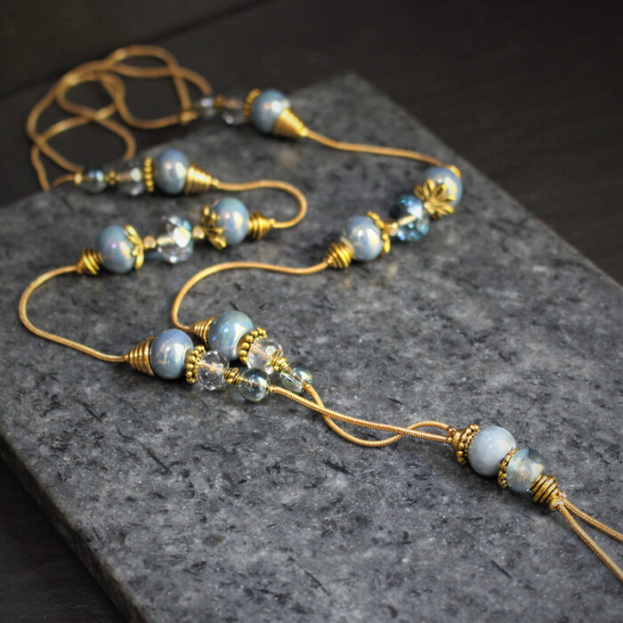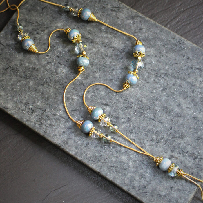 Laiton doré à l’or fin, céramique, cristal de roche et pâte de verre.