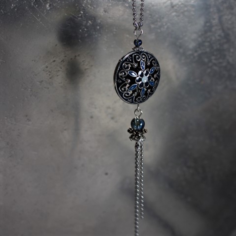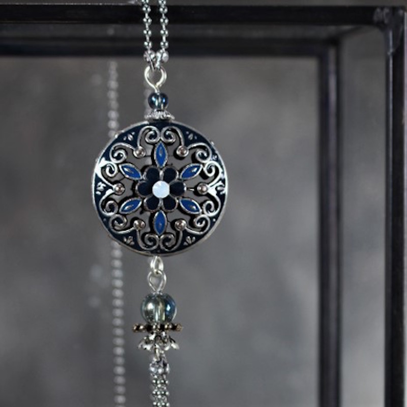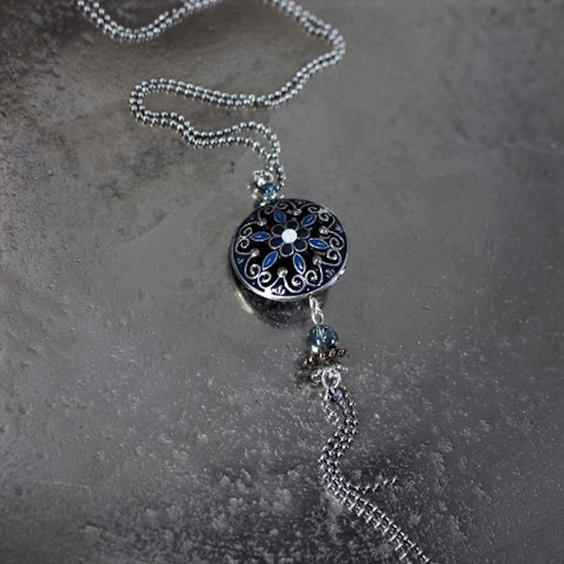 Laiton argenté sans nickel. émail et cristal de roche.