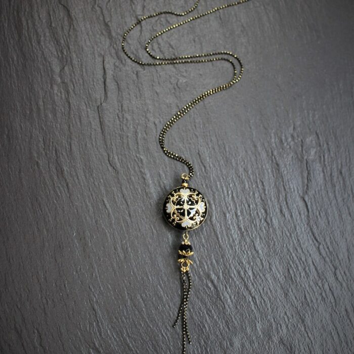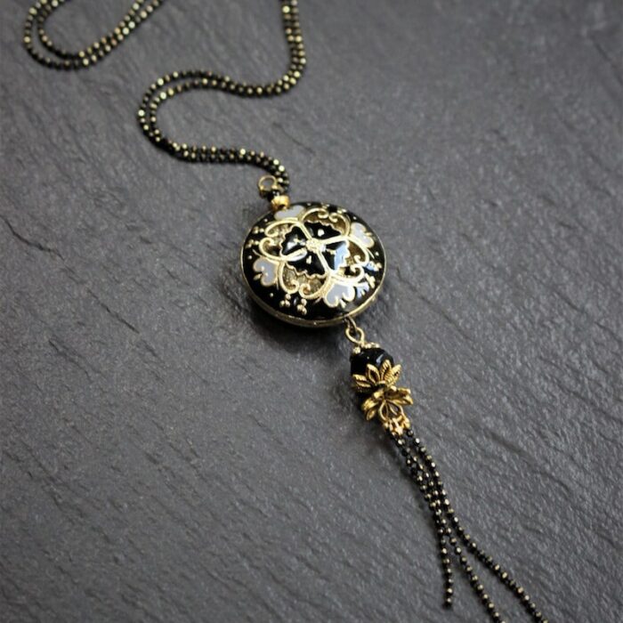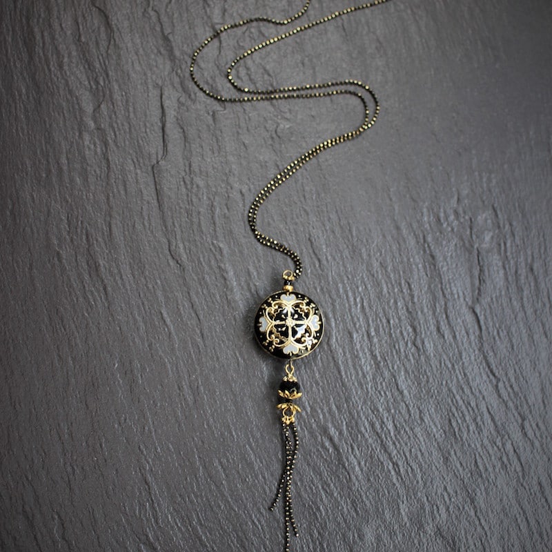 Laiton doré à l’or fin et coloré noir. émail et pâte de verre.
